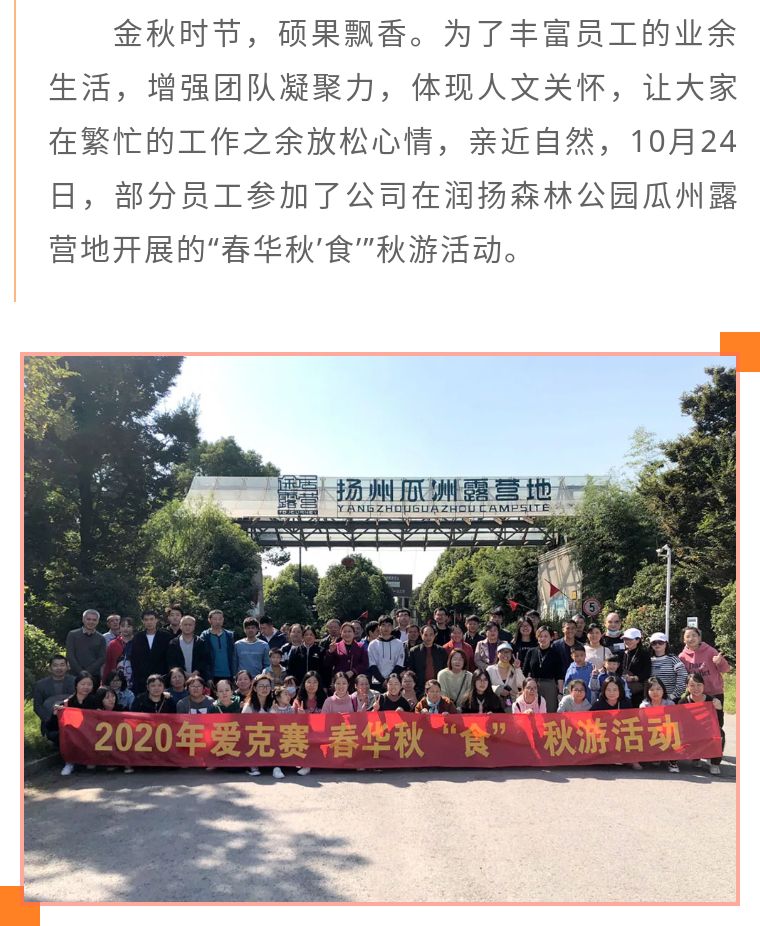 整個(gè)秋游活動(dòng)井然有序、其樂(lè )融融,不僅讓員工欣賞了美麗的風(fēng)景,還拉近了彼此之間的距離,體會(huì )到了團結協(xié)作的重要性,為今后營(yíng)造出健康和諧、積極向上的工作氛圍打下了基礎,同時(shí)展現了員工的活力與風(fēng)采。祝愿愛(ài)克賽人傳承二十年多來(lái)的務(wù)實(shí)與創(chuàng )新,體會(huì )春天播種、秋天收獲的真諦,用智慧與勤勞迎接美好的明天!
