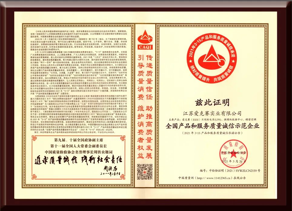品質(zhì)擔當,誠信護航。2021年是國家新一輪百年計劃的起始年,也是國家“十四五”規劃的初始之年,愛(ài)克賽將始終堅持產(chǎn)品創(chuàng )新、質(zhì)量領(lǐng)先,深入實(shí)施質(zhì)量強企戰略,充分發(fā)揮質(zhì)量誠信標桿企業(yè)的示范引領(lǐng)作用,落實(shí)企業(yè)主體責任,強化企業(yè)使命擔當,唱響中國質(zhì)量“好聲音”,為中國電源事業(yè)的發(fā)展貢獻出更多的力量。