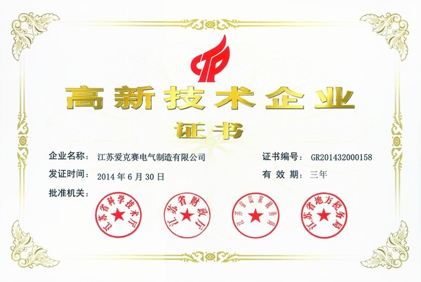 江蘇愛(ài)克賽電氣制造有限公司(以下簡(jiǎn)稱(chēng)“愛(ài)克賽電氣”)近年來(lái)持續進(jìn)行科技研發(fā)和技術(shù)成果轉化,不斷累積企業(yè)核心自主知識產(chǎn)權。2014年4月1日愛(ài)克賽人的努力,得到了國家及政府的肯定,再次榮獲2014年國家高新技術(shù)企業(yè)(以下簡(jiǎn)稱(chēng)“高企”),并于2014年7月1日正式公示評定結果,這份可喜的榮譽(yù)是愛(ài)克賽人共同努力的成果。